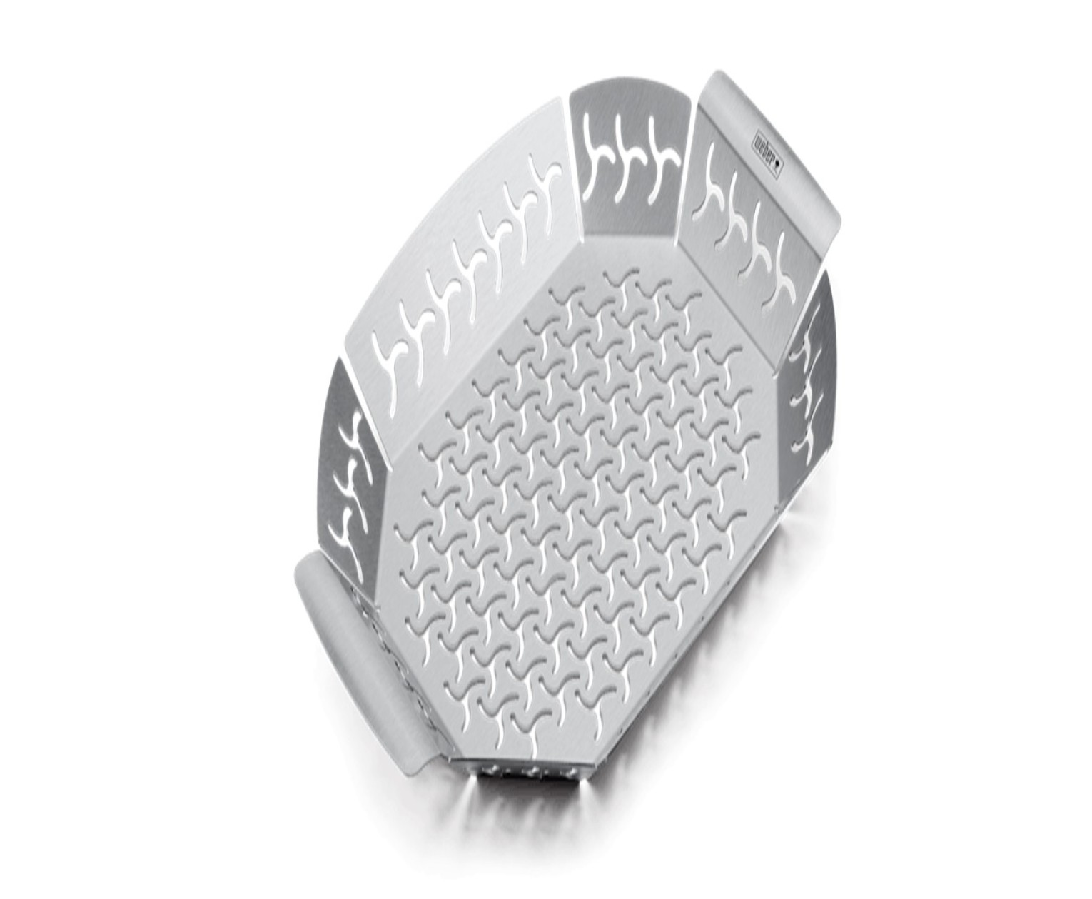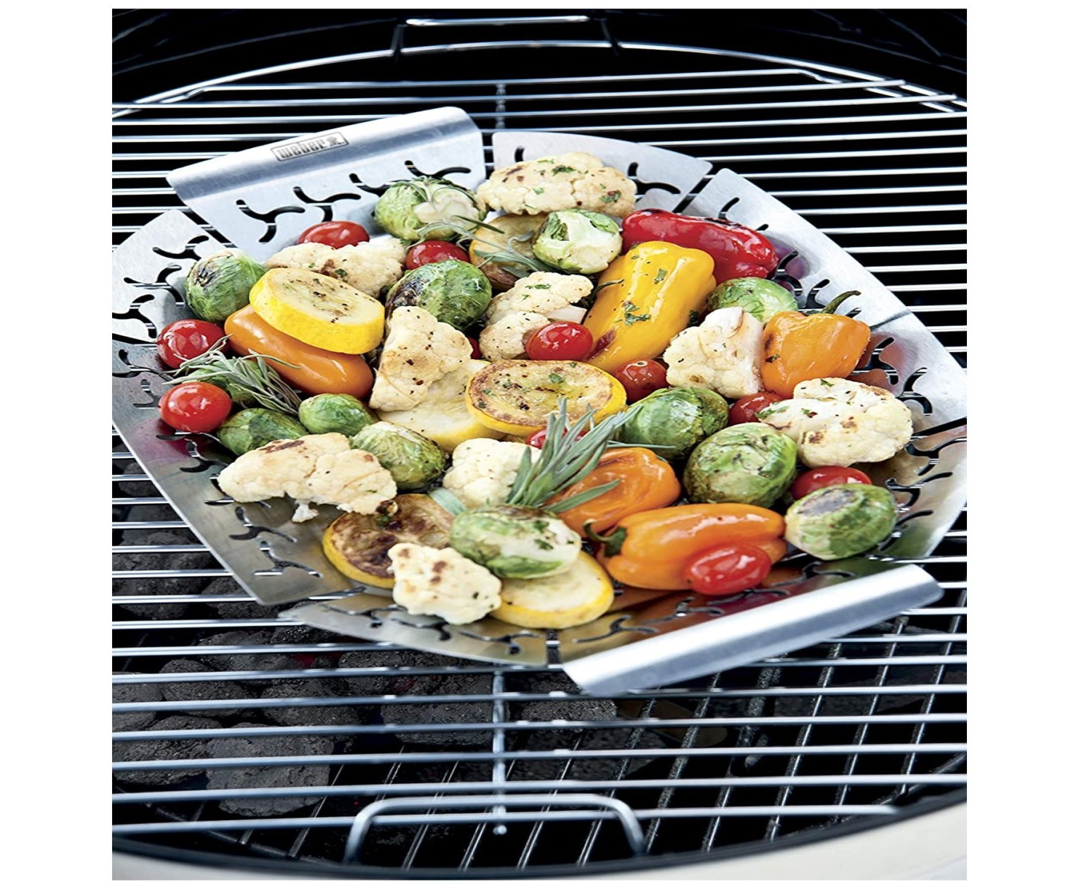 - Ideal for grilling vegetables and other small foods on your barbecue. The cut outs allow your food to get that lovely smoky taste that everyone associated with a barbecue. The sturdy shape and handles