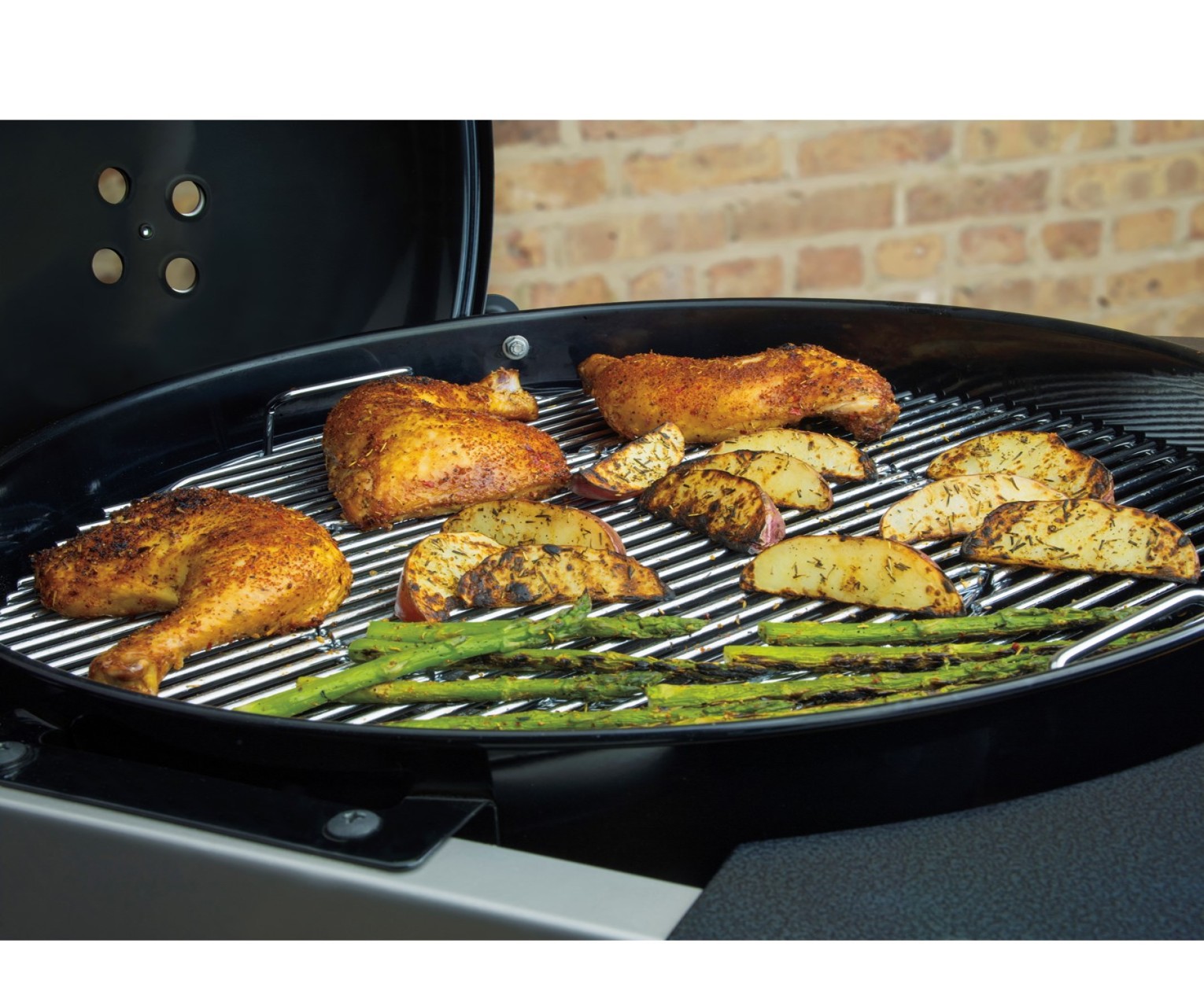 • Porcelain-enamelled bowl and lid with Tuck-Away lid holder • 57 cm stainless steel Gourmet BBO System cooking grate • lid thermometer • Weather-proof handle with protective heat shield • Rust-proof aluminium lid vent with heat resistant plastic handle provides • Painted metal work surface with 3 tool holders and backlit LCD timer • Touch-N-Go electronic gas ignition lights your charcoal quickly with the push of a button • Stainless steel One-Touch cleaning system and rust